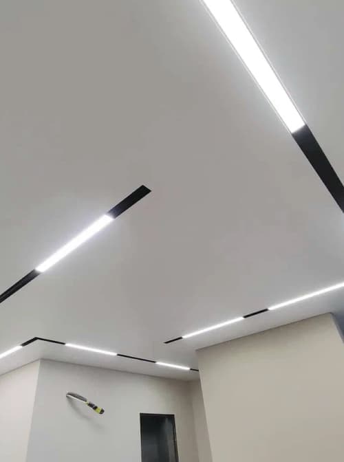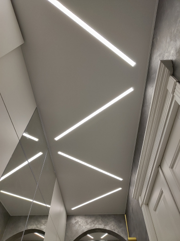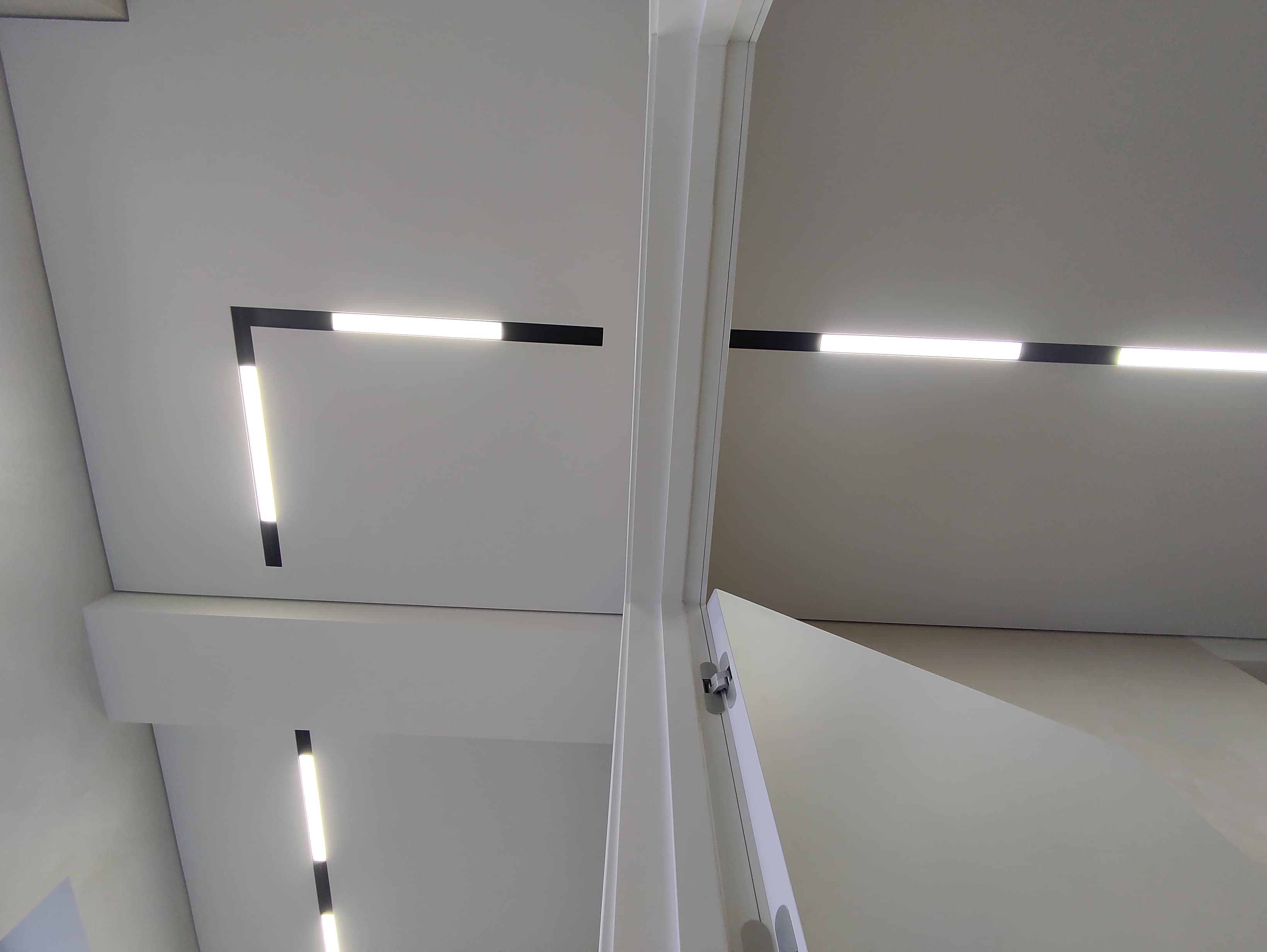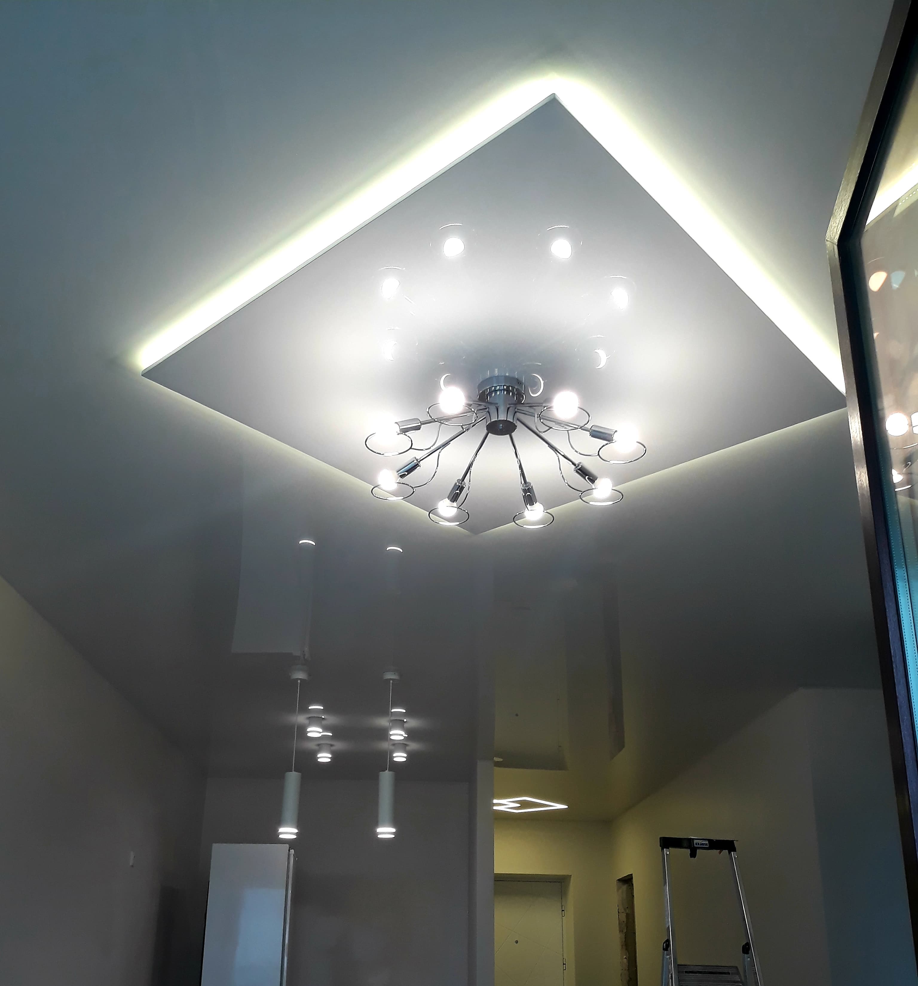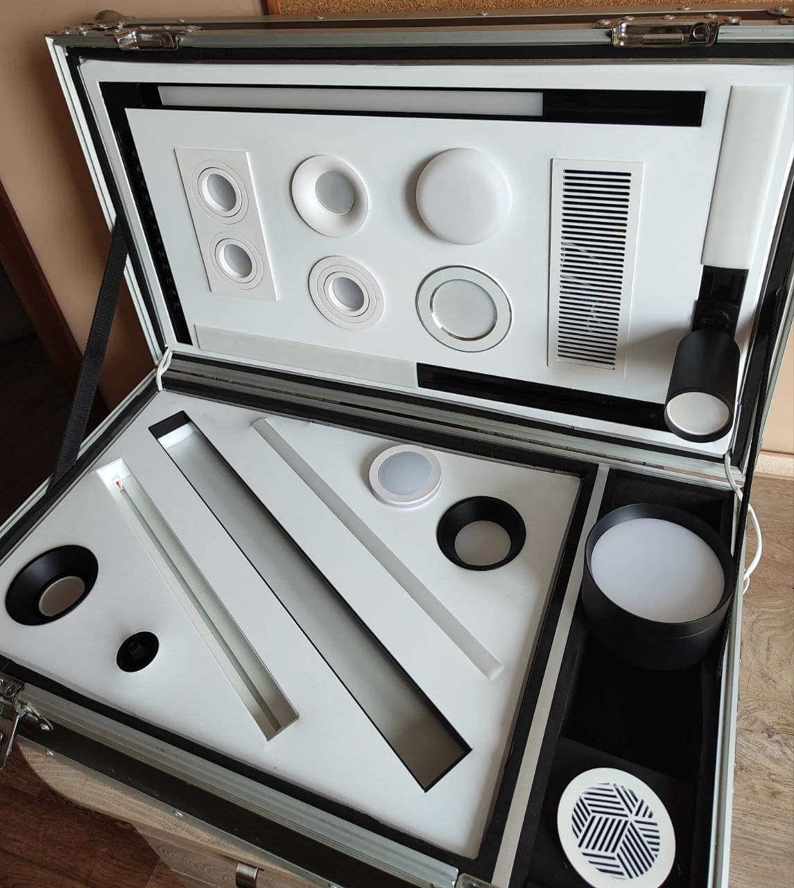 У нас есть с собой чудесный чемодан с образцами светодиодных лент, точечных светильников и подсветки. Вы сможете выбрать подходящий вариант для вашего интерьера и убедиться в том, что будет сочетаться с цветом и оттенком вашего натяжного потолка.