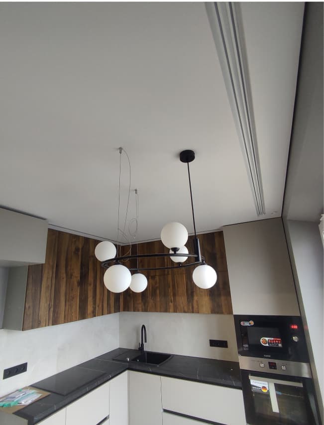 - На втором уровне потолка можно скрыть проводку, вентиляционные и кондиционерные системы